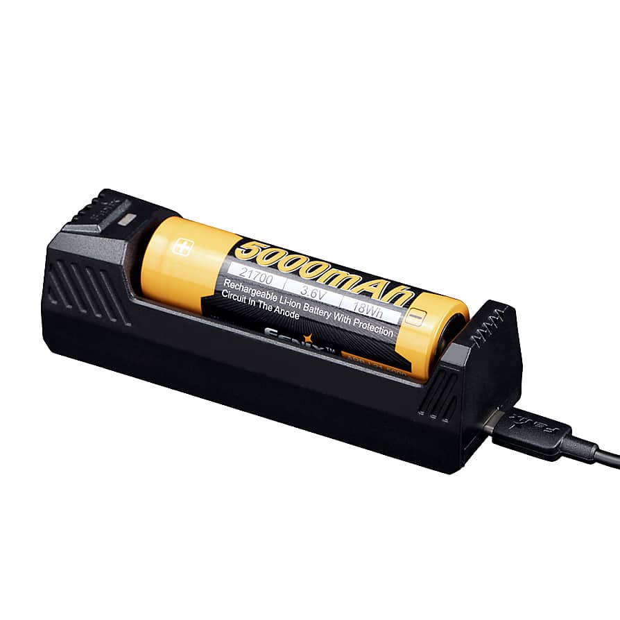Fenix ARE-X1 V2.0 Charger for the 18650, 21700 and 26650 rechargeable batteries Uses a USB Type-C cable to charge the battery from any USB source. Can also discharge the battery to top up a connected mobile phone or other device. BATTERY NOT INCLUDED