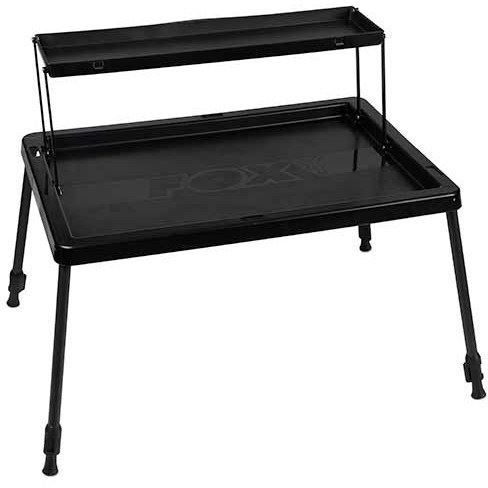 The Fox 2 Tier Table, a great way to maximise storage space inside your bivvy. Ideal for keeping all your essential items close to hand and providing a handy platform for everything from rig building to resting tablets and laptops. With spring locking adjustable locking legs that fold back flat against the tabletop itself. They weigh in at a lightweight 1.8Kg and fold down to a mere 2.6cm in width.