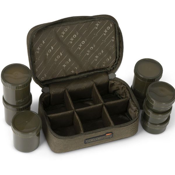 Fox Voyager Hookbait Pot Cases, a smart hookbait storage solution supplied complete with six or eight watertight screw top hookbait tubs. Ideal for storing a wide range of hookbaits, dips, baits and liquids confident they wont leak everywhere during transport. Manufactured from a hard wearing and water resistant 300D treated polyester fabric and with stiffened Velcro fastening inserts you can use to customise to your own requirements.